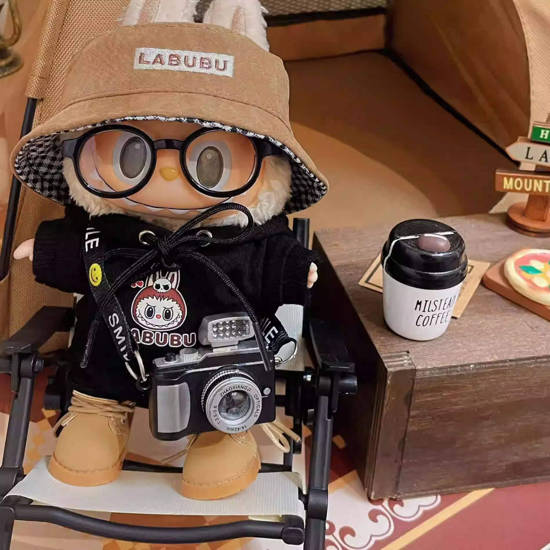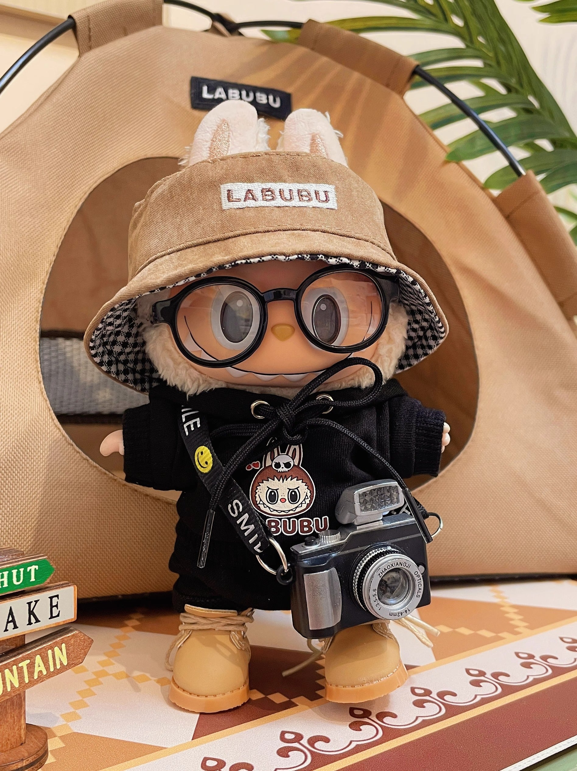 The set includes khaki hat + glasses + camera + top + pants + shoes